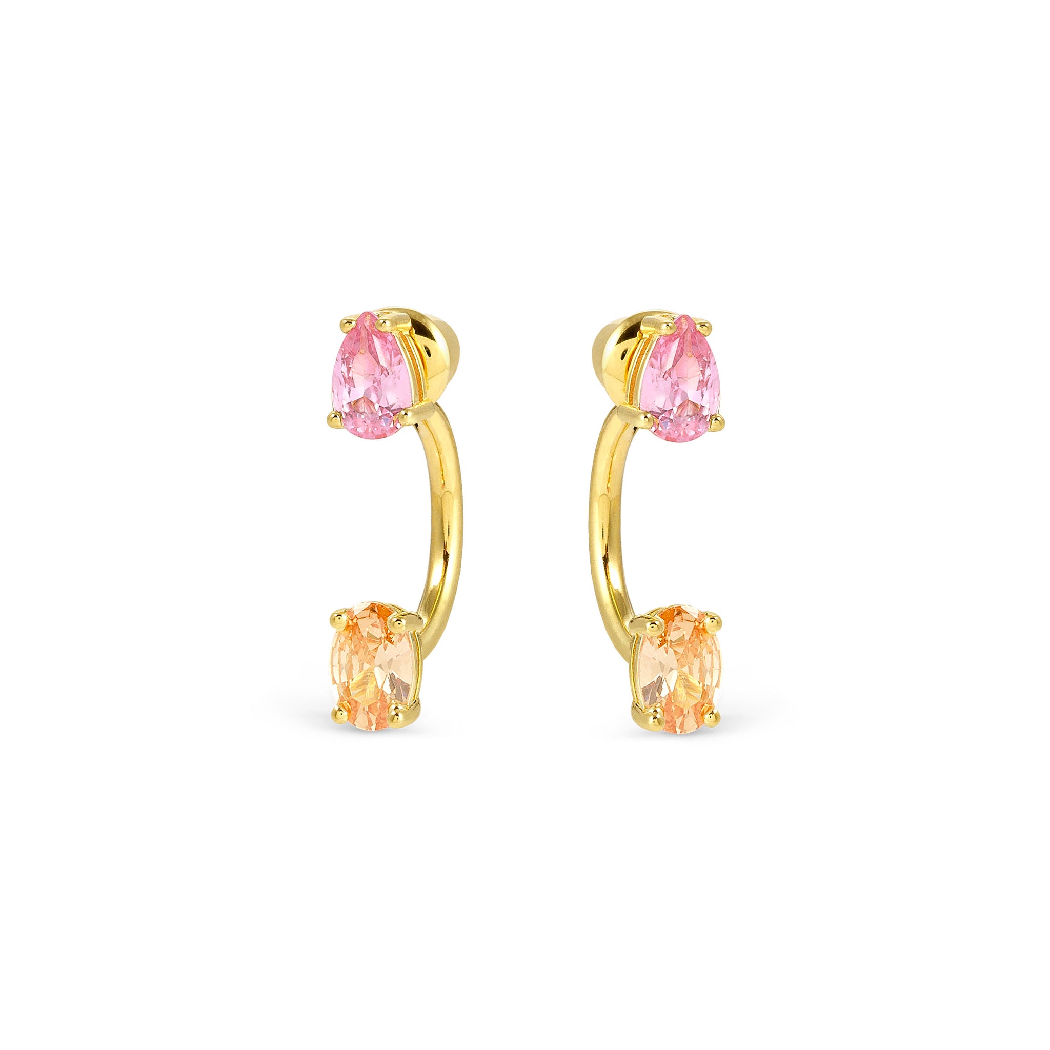 Elevate your everyday elegance with these 18k gold-plated sterling silver stud earrings, featuring two dazzling pink and champagne cubic zirconias, one tear drop, one oval. Their timeless design adds a sophisticated sparkle, perfect for both casual and formal occasions.