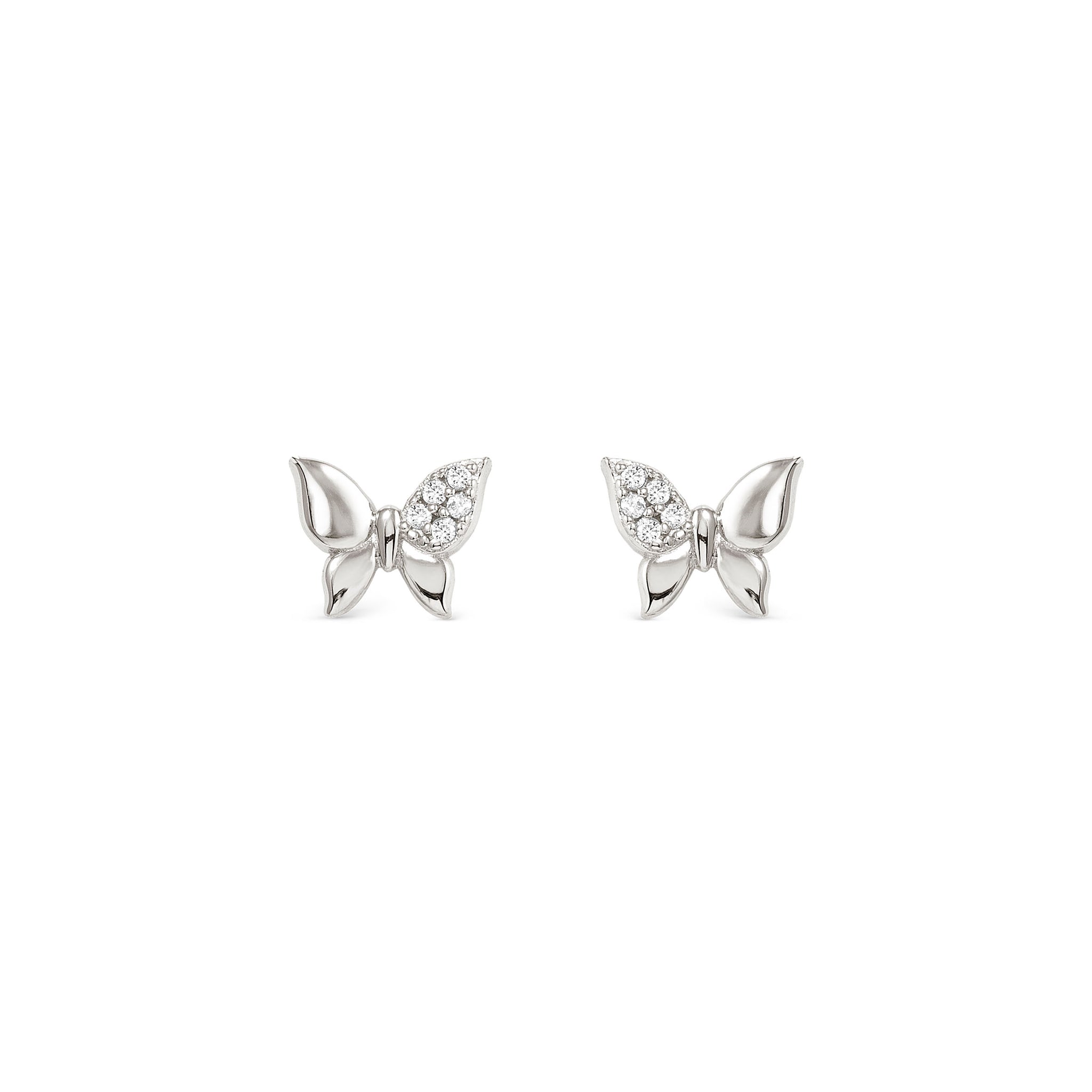 These sterling silver butterfly stud earrings are accented with sparkling white cubic zirconia, adding a touch of elegance and sparkle to your everyday look.