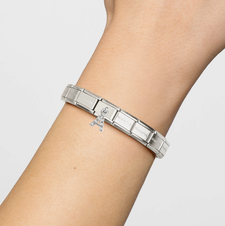 Original Composable Link for Nomination's Composable Classic Bracelet with Letter A pendant with Cubic Zirconias in sterling silver on stainless steel link. Made in Italy.