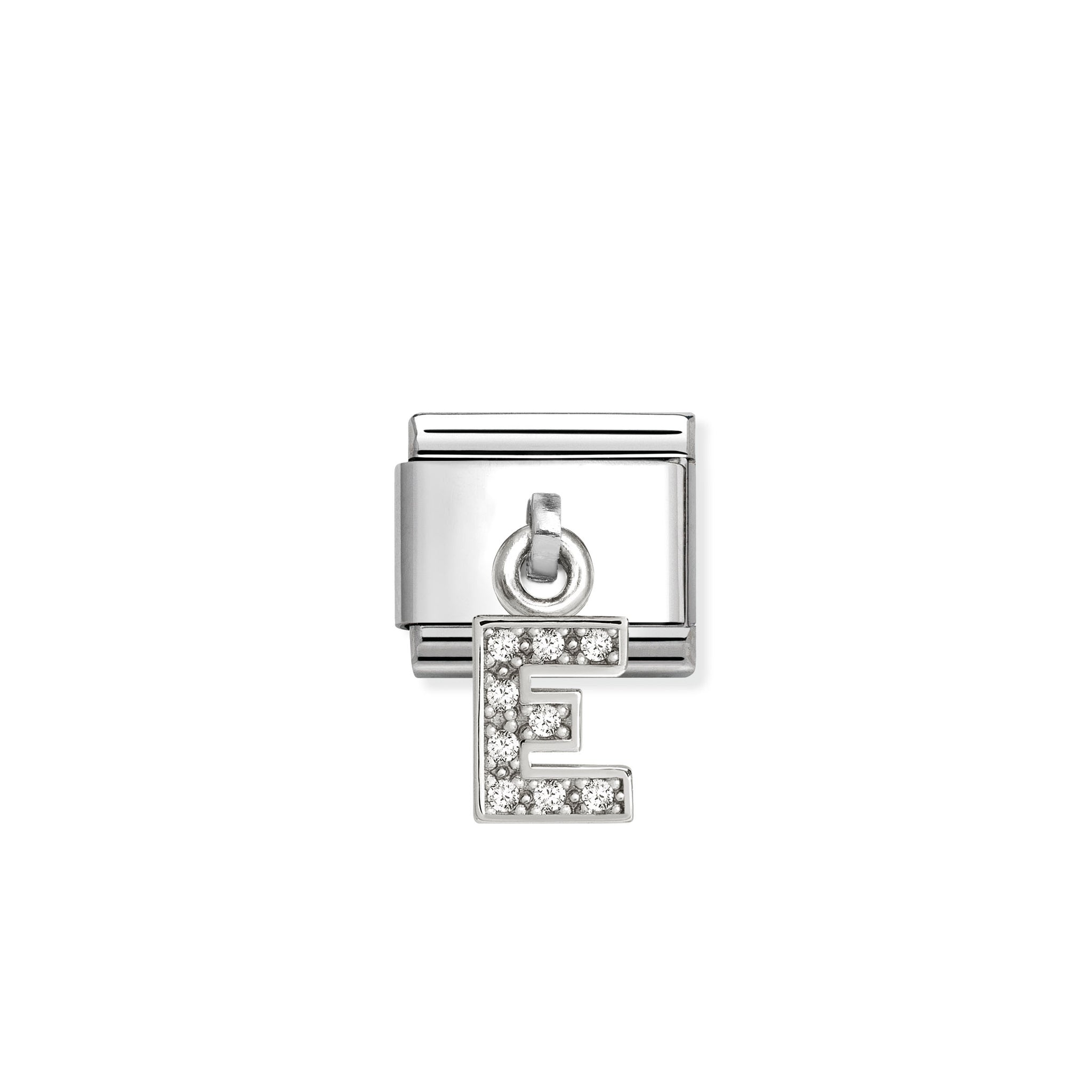 Original Composable Link for Nomination's Composable Classic Bracelet with Letter E pendant with Cubic Zirconias in sterling silver on stainless steel link.  Made in Italy.