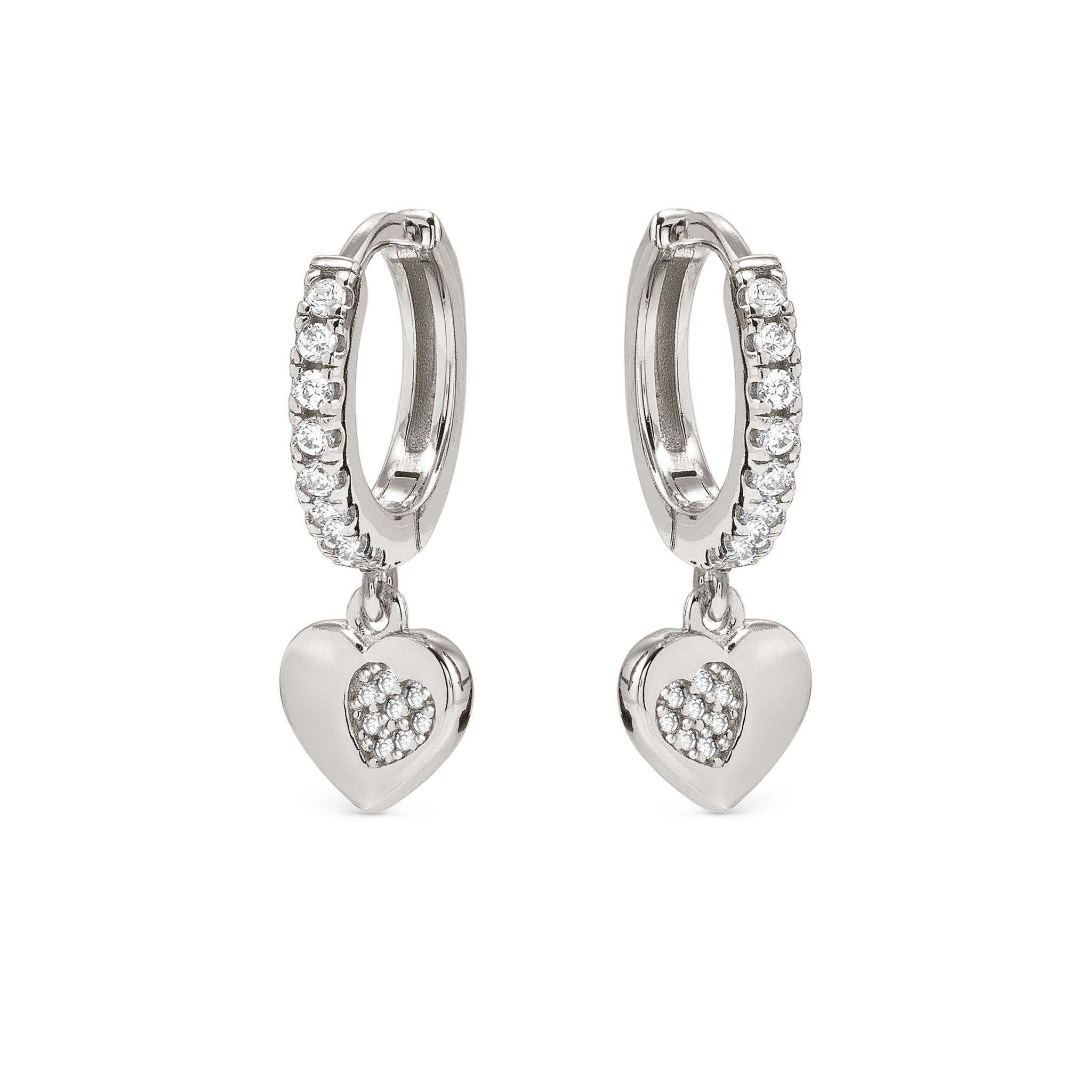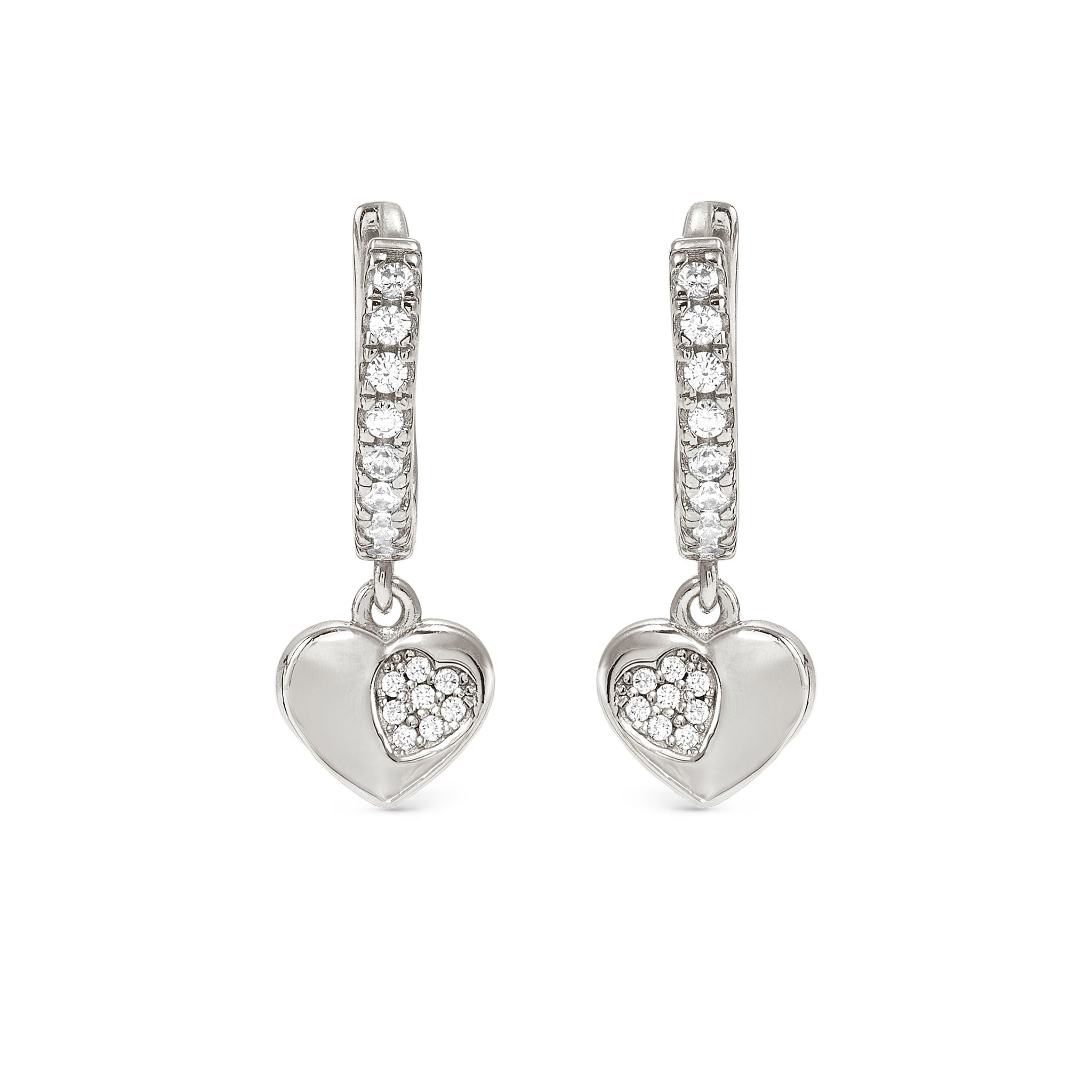 Elevate your everyday look with these sterling silver hoops featuring sparkling white cubic zirconias and a charming dangling heart pendant.