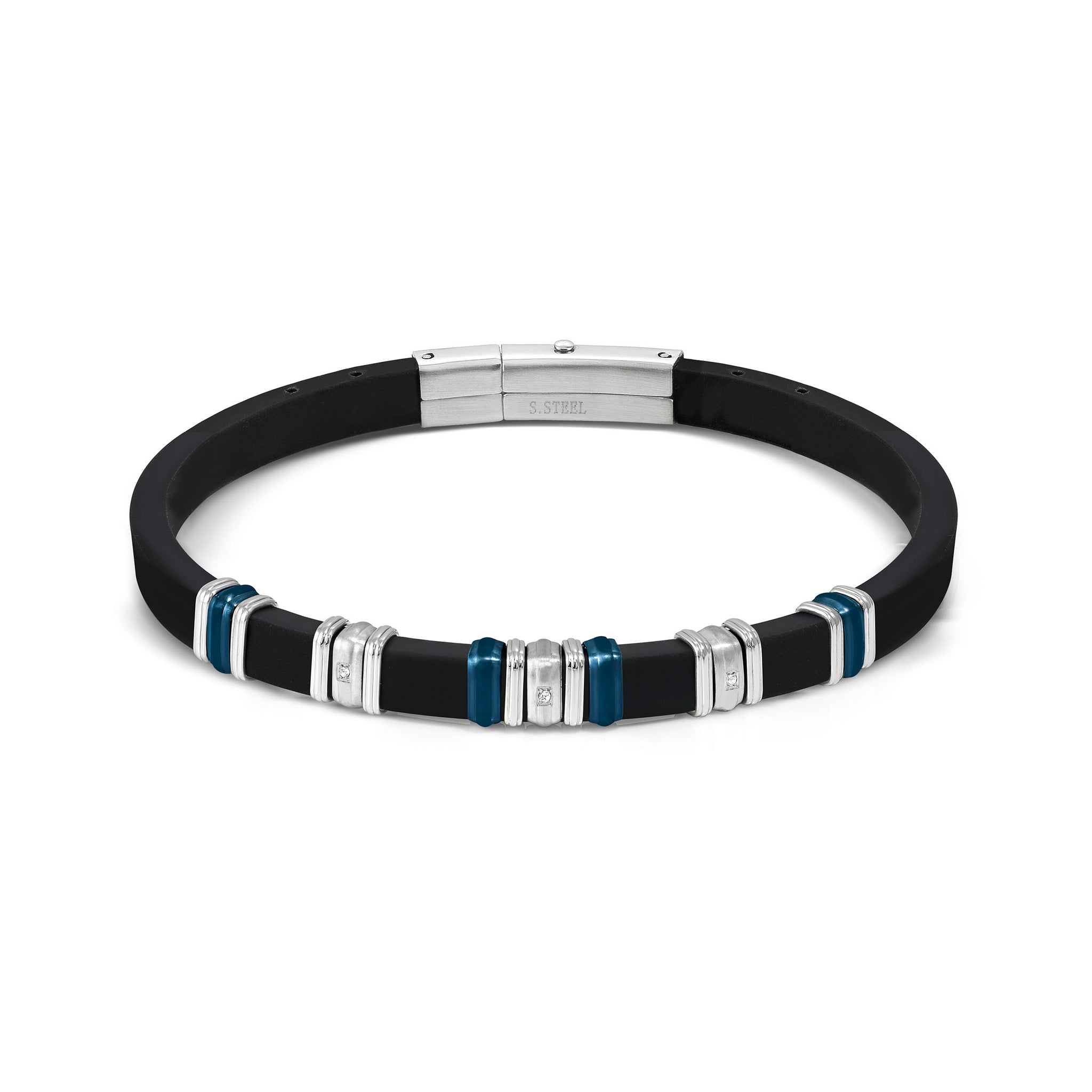 Bracelet in rubber and hypoallergenic stainless steel, blue PVD details and white cubic zirconia.